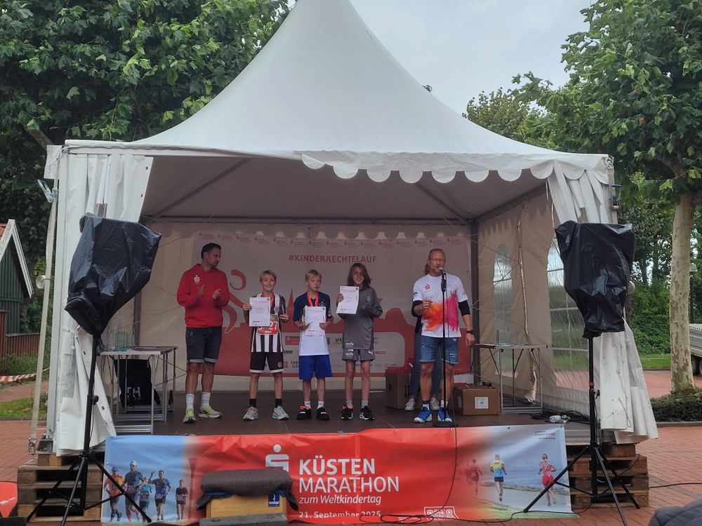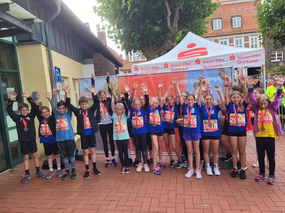 Im September fand im Herzen Otterndorfs der Küstenmarathon statt – in diesem Jahr zum 25. Mal. Vom Schüler:innenlauf über 1000, 2000 und 5000m über den traditionellen 10 Km-Lauf bis hin zum Marathon war alles dabei. Als „Jubiläums-Special“ wurde die Halbmarathon-Distanz von 21 Km in diesem Jahr auf 25 Km verlängert. Beim Küstenmarathon, der zum Weltkindertag die Kinderrechte in den Fokus stellt und für Kinder auch jede Menge „drumherum“ in den Kinderwelten am Kirchplatz bietet, können Schüler:innen gesammelt über die Schulen zu vergünstigten Startgebühren gemeldet werden. Für das Gymnasium Otterndorf gingen letztlich über 30 Schüler:innen der Klassenstufen 5 bis 9 über die 2000 – oder aber die 5000m-Strecke an den Start. Welch tolle Resonanz!